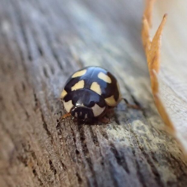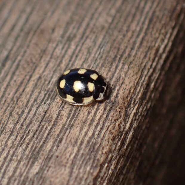 黒いはねに薄い黄色の紋がある小さなテントウムシ。 胸の基部は黒く、 波のような模様(4つの指状の形)が特徴的です。 冬、 ケヤキの樹皮の下で、 越冬している姿を見ることが多いです。