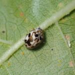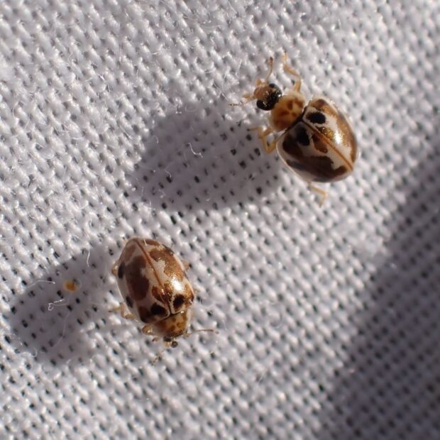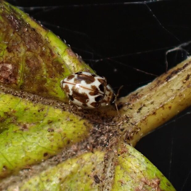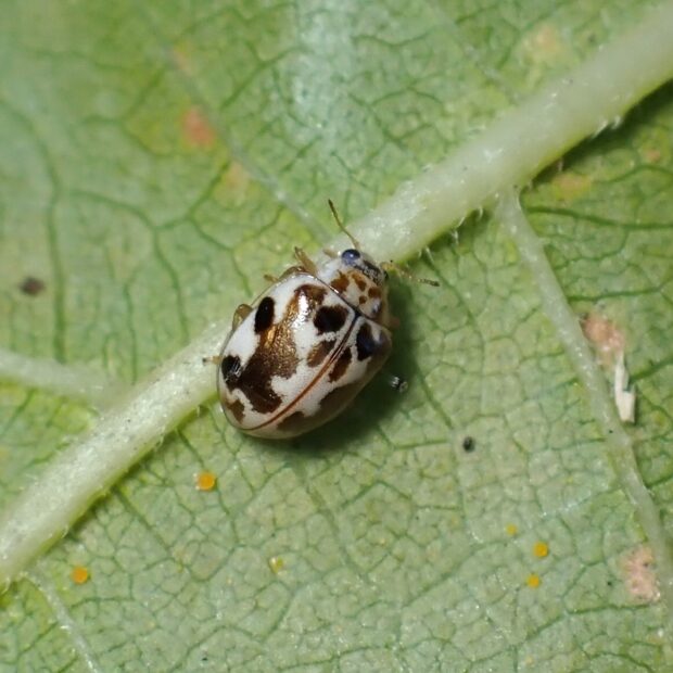 白っぽい体に、 黒、 茶色、 金色の紋がある小さなテントウムシ。 1984年に東京港付近で最初に発見された、 北アメリカ原産の外来種です。 雲のような模様からクモガタと名づけられました。