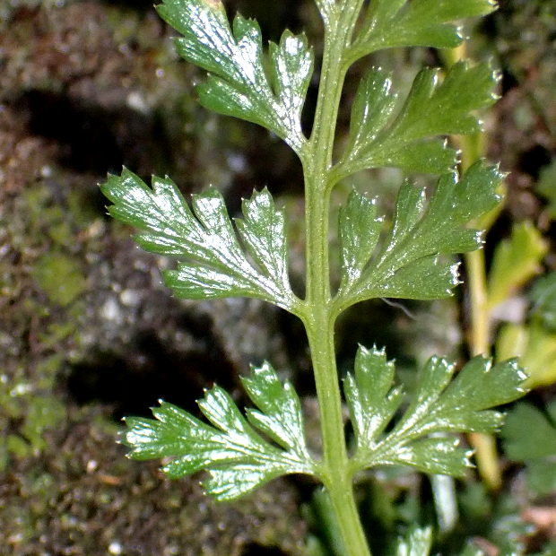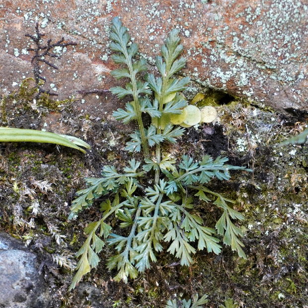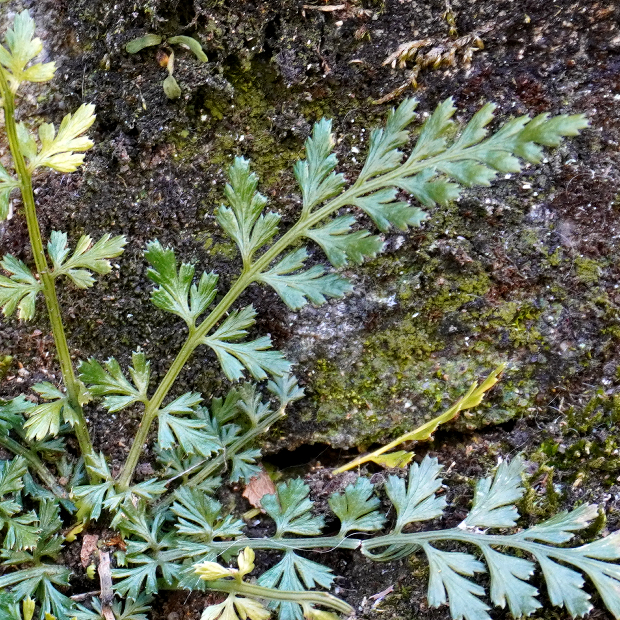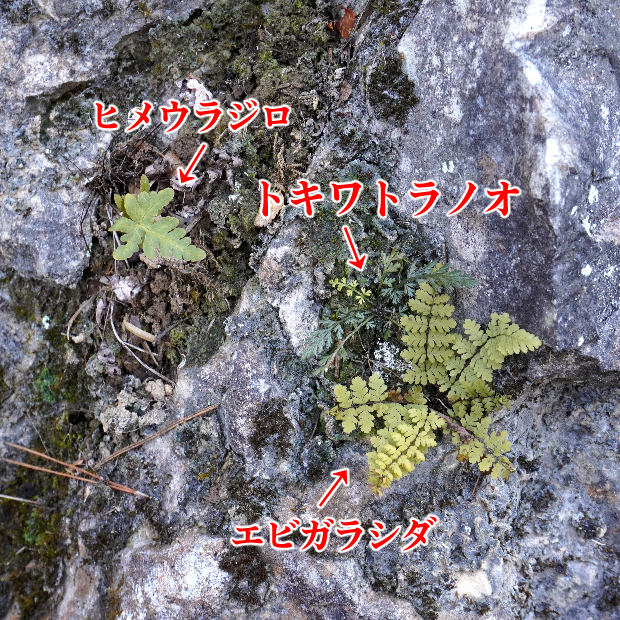 岩場に生える小さめのシダ。 似たコバノヒノキシダよりも濃い緑色で厚くて光沢があり、 一番下の羽片が扇のような形になります。 名前の常盤(ときわ)は一年中緑色の葉をつけていることに由来します。 トラノオはそのまま虎の尾に似ていることにちなみますが、 そうは…見えないかも?