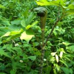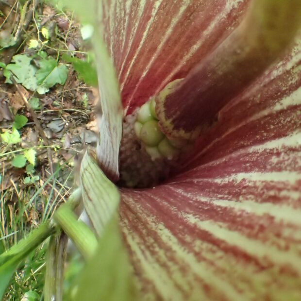 茎(偽茎)に蛇のマムシのような模様があるのが名の由来です。 茎の先端にある筒状の部分(苞)の中に棒状のものがあり、 その周りに花がつきます。 苞の色や形に変異が多く雑種もできやすいため、 マムシグサの分類はまだ途上です。 ここでは、 カントウマムシグサ(広義)を念頭にマムシグサと表記しています。