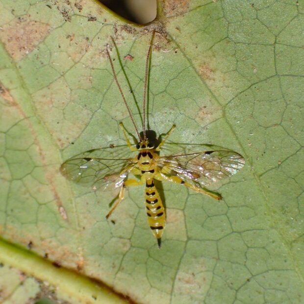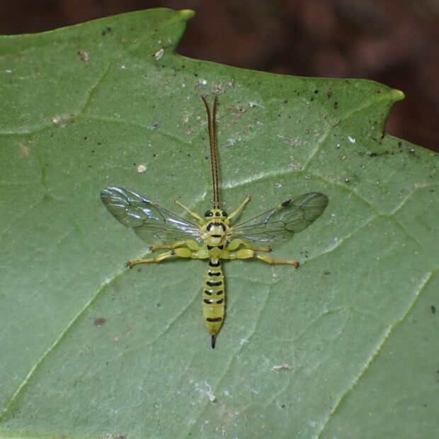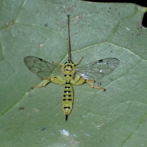 ヒメバチの仲間。 体は鮮やかな黄色で、 黒い模様があります。 チョウやガの幼虫に寄生する寄生バチで、 葉の裏で越冬している姿を見ることが多いです。 大阪府の箕面で最初に発見されたことから、 「ミノオ」と名づけられたようです。