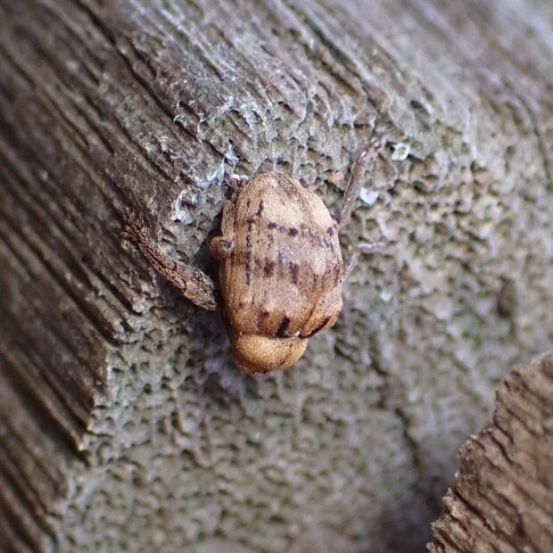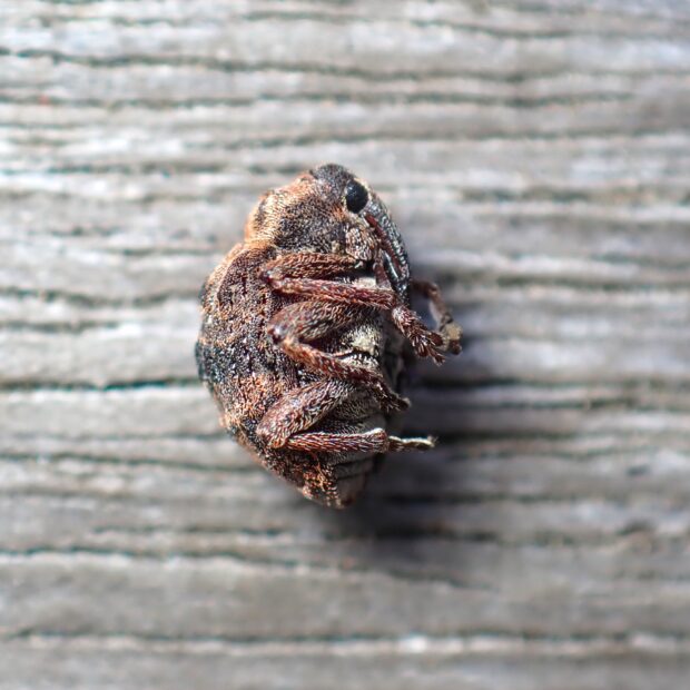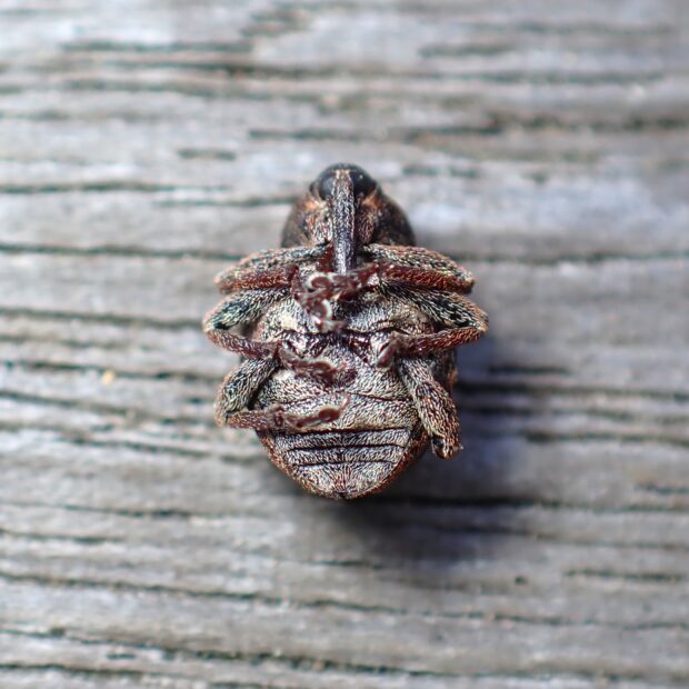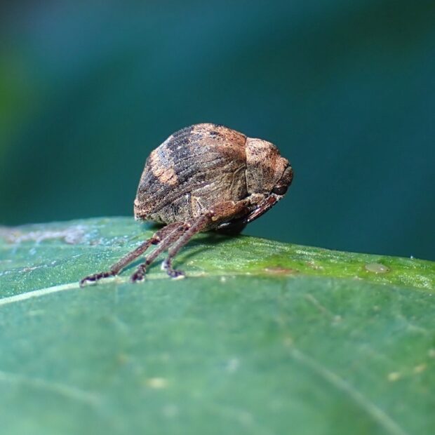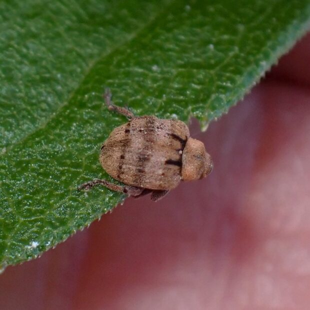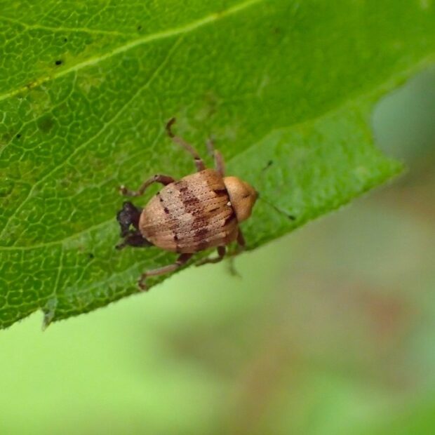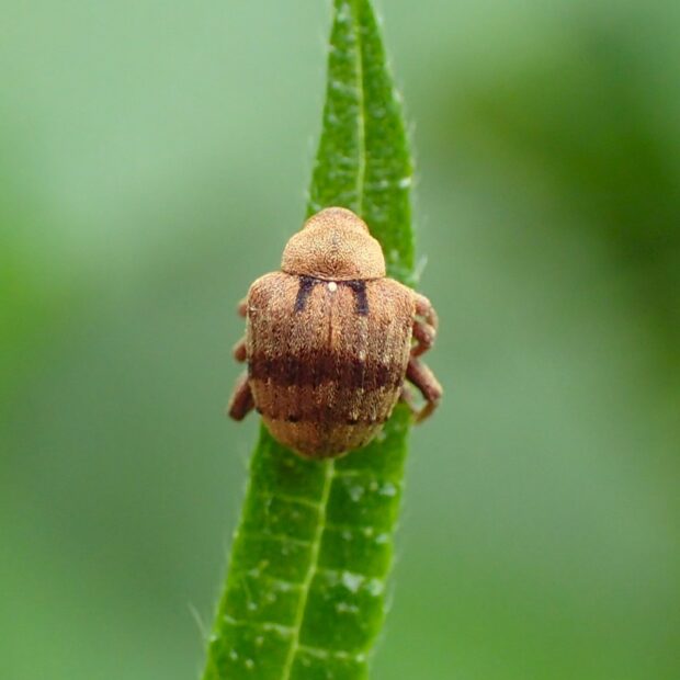 名前に「オオ」がついていますが、 小さなゾウムシ。 茶色の上翅(じょうし)に、 こげ茶色の筋が目立ち、 少し角張って見えます。 ミスジマルゾウムシに似ていますが、 本種の方が大きく胸にたて筋がありません。