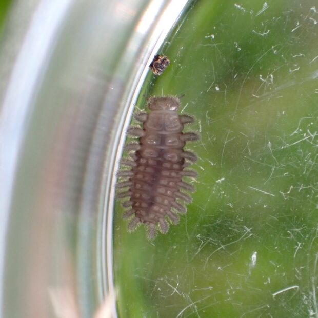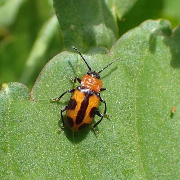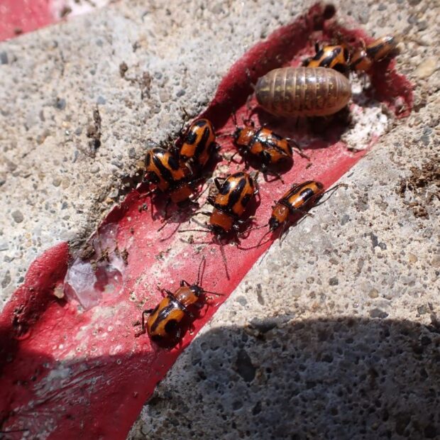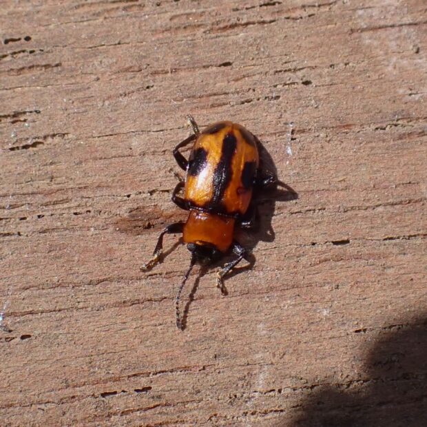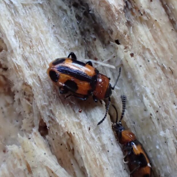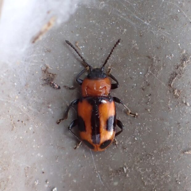 テントウムシダマシの仲間。 テントウムシではありません。 オレンジ色の体に4つの黒い紋が特徴的。 石の下や植物の根際、 朽ち木などで普通に見られます。 石の下などで、 成虫が集まって越冬することがあります。