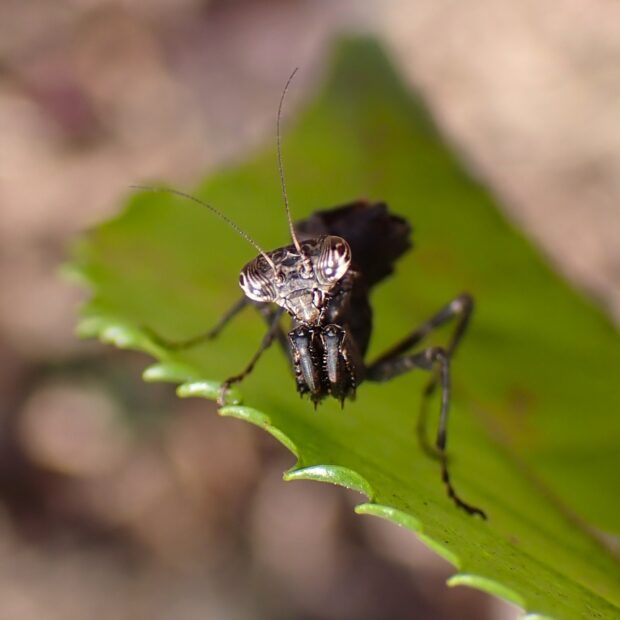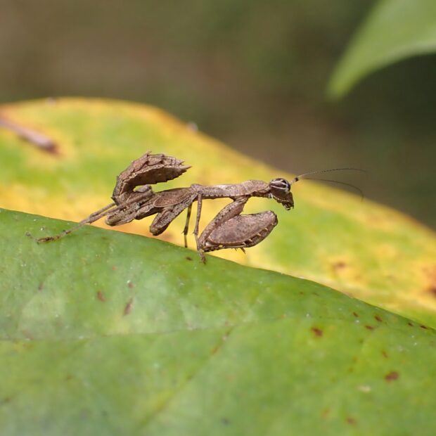 ハナカマキリの仲間。 緑色と茶色の小さなカマキリ。 雑木林や照葉樹林の林縁部などの樹上にいることが多く、 危険を感じると、 地表に落ちて死んだふりをします。 夜、 明かりにやって来ます。