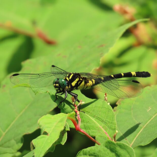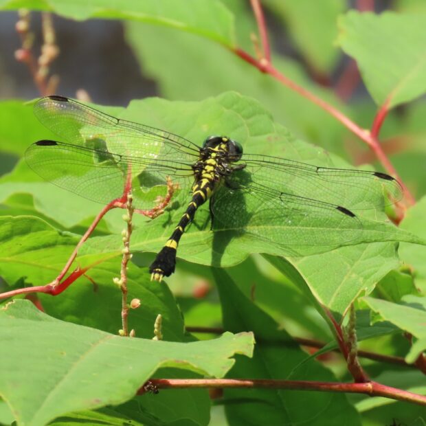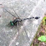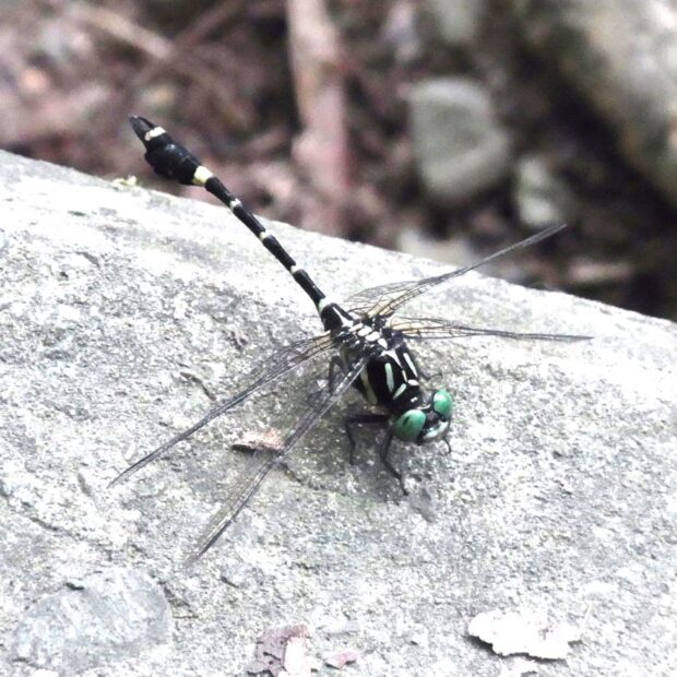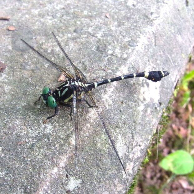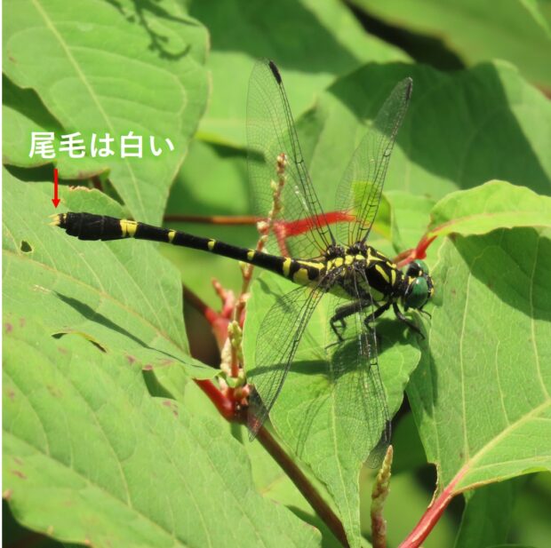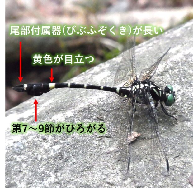 樹林に囲まれた川の上~中流域で見られる中型のサナエトンボ。 オスは腹部の先端の尾部付属器(びぶふぞくき=メスと連結するとき頭の後ろをはさむもの)が黒くて大きく長いのが特徴です。 これが名前の由来になっています。 川で羽化すると、 近くの林に移動して過ごします。