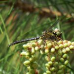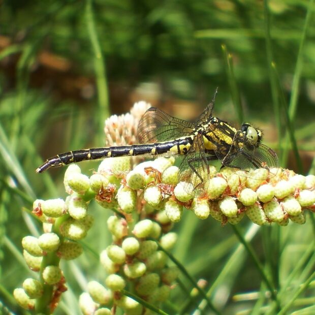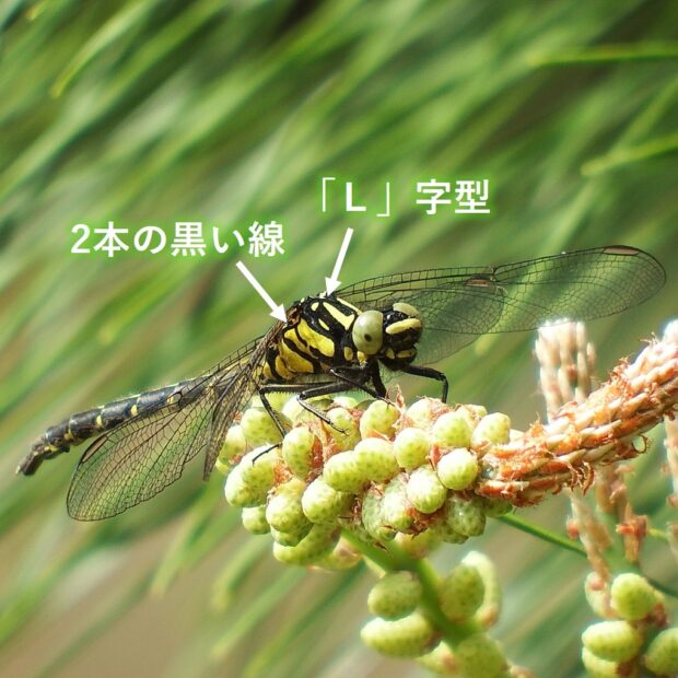 静岡より西の地域で見られるサナエトンボの仲間。 樹林に囲まれた水生植物が茂る池などを好みます。 胸側面に黒い筋が2本ありますが、 1本であったり、 途中でとぎれるものも見られます。 成熟したオスは、 池の周囲の葉にとまり縄張りをもちます。 日本固有種。