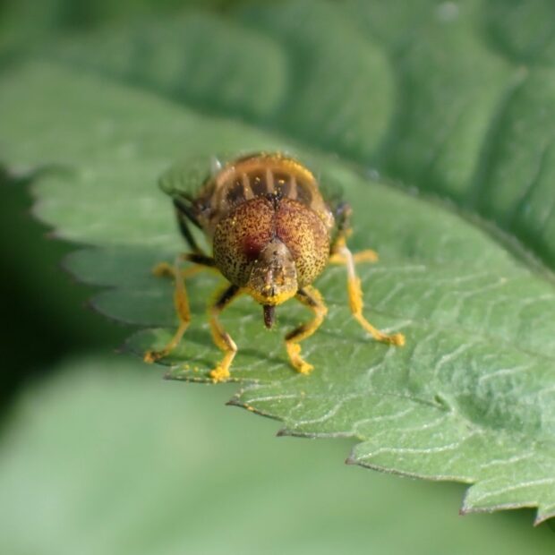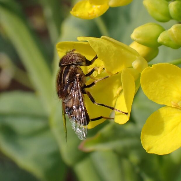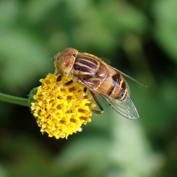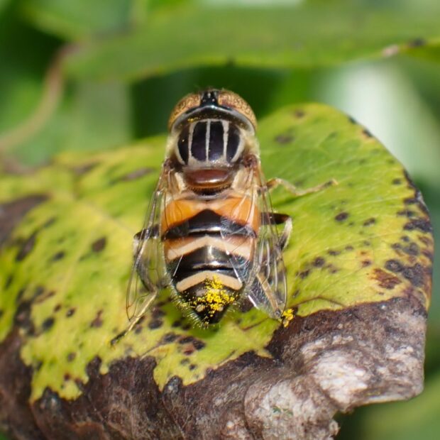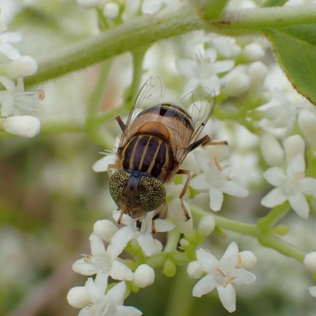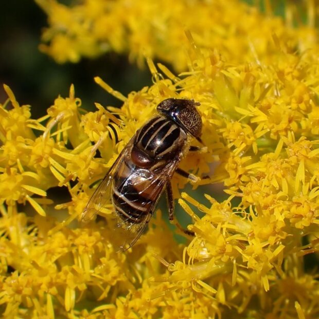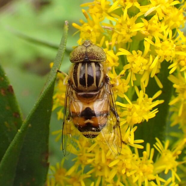 ハナアブの仲間。 まだら模様の黄色い複眼、 胸のはっきりとした縦じまが特徴。 いろいろな花で、 秋に多く見られます。 幼虫は池や下水溝で育ちます。