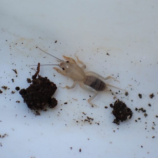 ケラ科。 コオロギに近い仲間。 金色の短いビロードのような毛でおおわれ、 シャベルのような前あしが特徴。 草はら、 田んぼ、 畑など湿った土に潜って地中で生活しています。 昔から「オケラ」と呼ばれ親しまれてきました。 初夏、 オスもメスも「ジー」「ビー」と鳴きますが、 以前はミミズの鳴き声と思われていました。