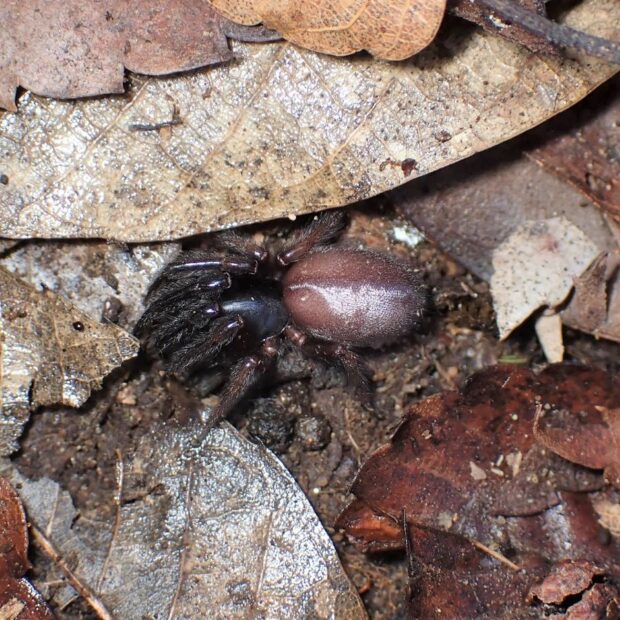 エンマグモの仲間。 全身光沢のある黒褐色をしており、 細かい毛が生えています。 樹林地や神社などで見られますが、 目につくことは少ないです。 スギやヒノキなどの樹皮の割れ目や樹皮の下、 岩の割れ目などに、 入り口に糸を引いた管状の住みかを作ります。