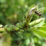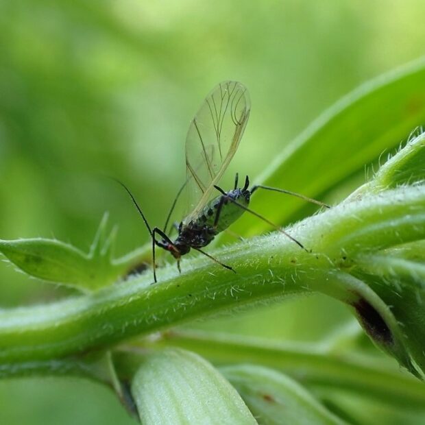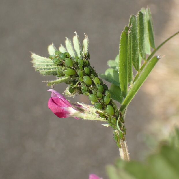 ソラマメやカラスノエンドウなどで集団生活をするアブラムシ。 春~夏、 メスは数世代にわたり、 交尾をせずに幼虫を産み、 どんどん増えていきます。 秋になるとオスが生まれてメスと交尾をし、 メスは卵を産みます。