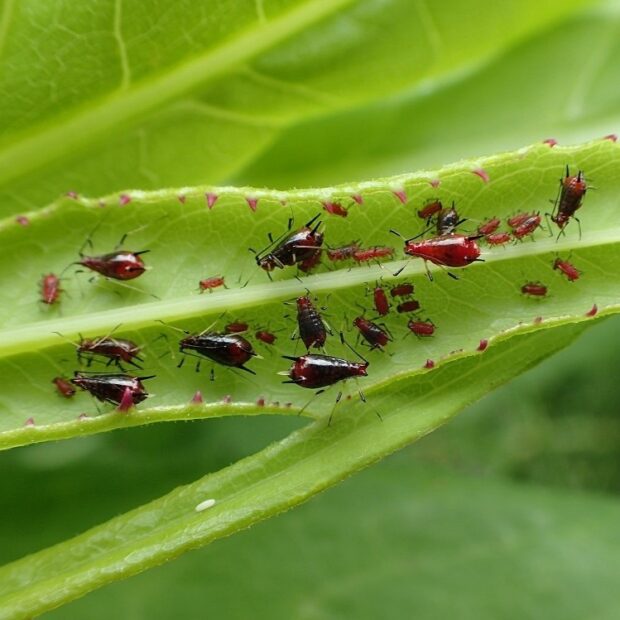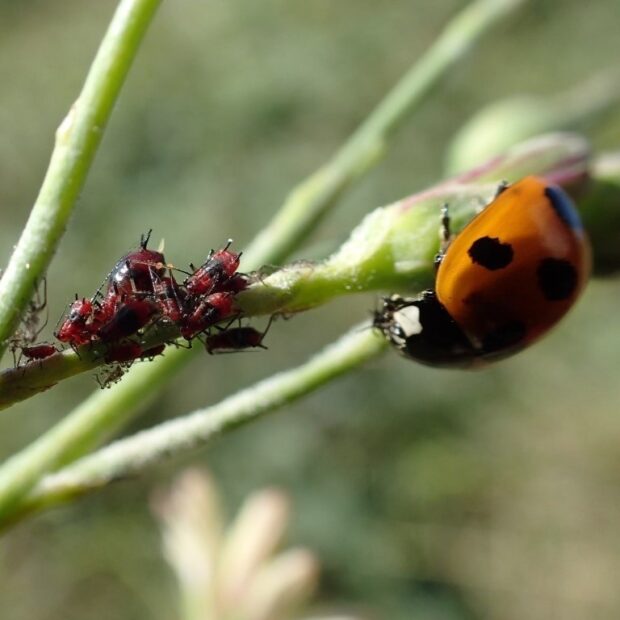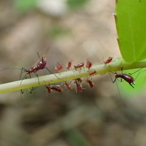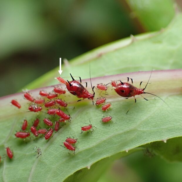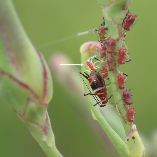 アキノノゲシなどノゲシの仲間で見られるアブラムシ。 触角が長く、 体は赤褐色で、 腹部の背中に黒い部分があります。
