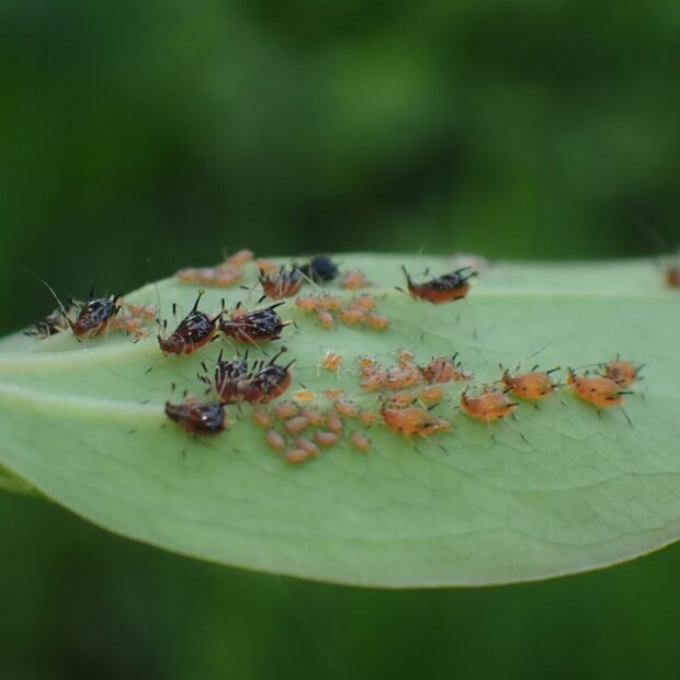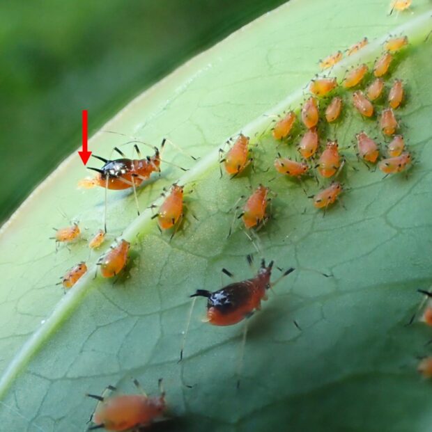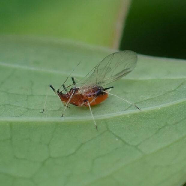 サルトリイバラからツリフネソウに移住するアブラムシ。 体はオレンジ色で腹部の背中は黒。 幼虫は、 黄緑色、 オレンジ色、 サーモンピンクの3つのタイプが知られています。