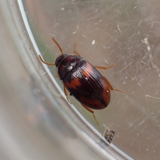 キノコゴミムシダマシの仲間。 倒木や朽ち木に生えるカワラタケなどのキノコで見られます。 光沢のある黒い体に赤い紋があります。 オスは頭部に1対の突起があり、 右のみが大きく先端に黄色い毛が生えています。 暖地では街中の街路樹でも見られることがあります。