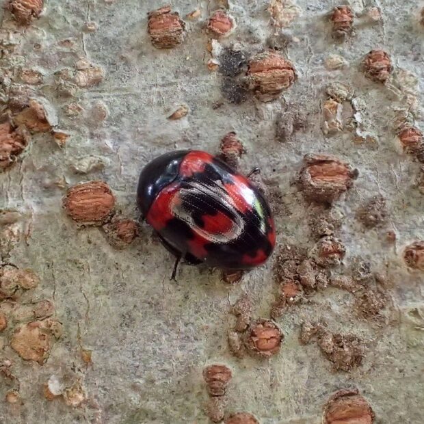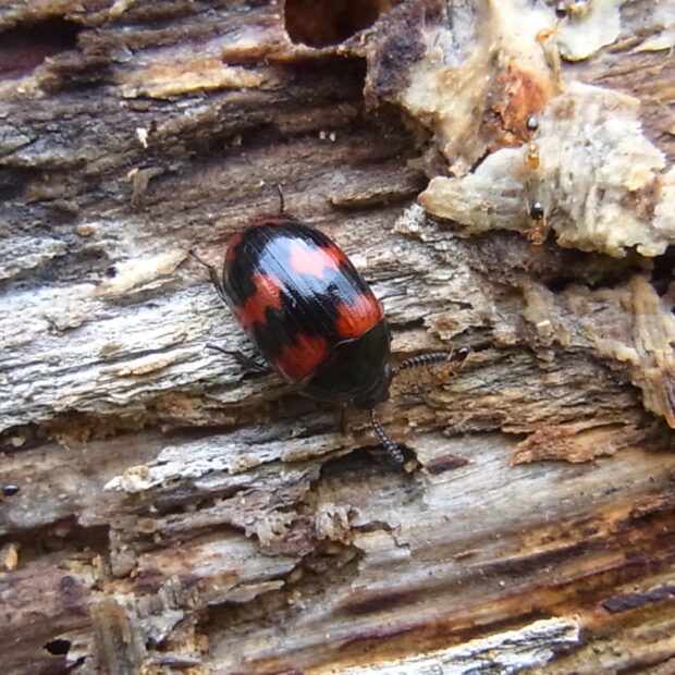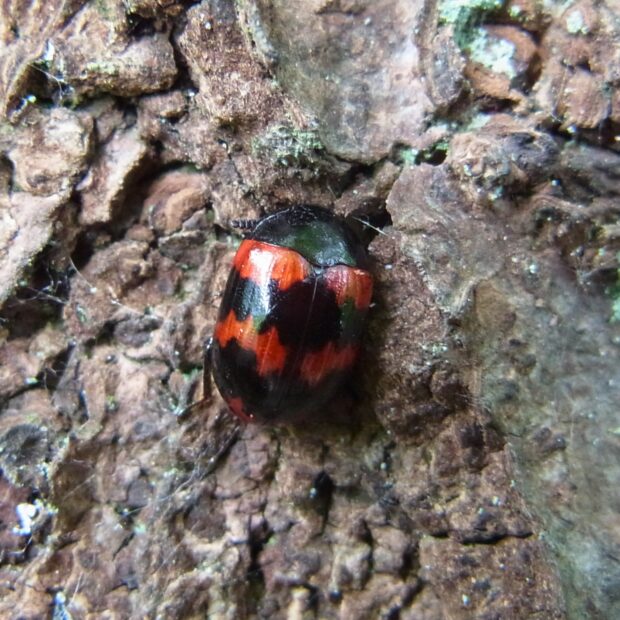 倒木のカワラタケなどで見られるキノコゴミムシダマシの仲間。 体色は黒く光沢があり、 上翅(じょうし)に赤い模様がありますが、 色や紋に地理的な変異が見られます。 メスはキノコに産卵し、 幼虫もキノコを食べて育ちます。