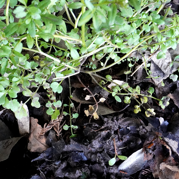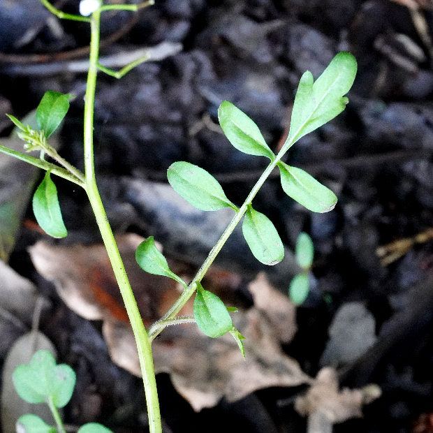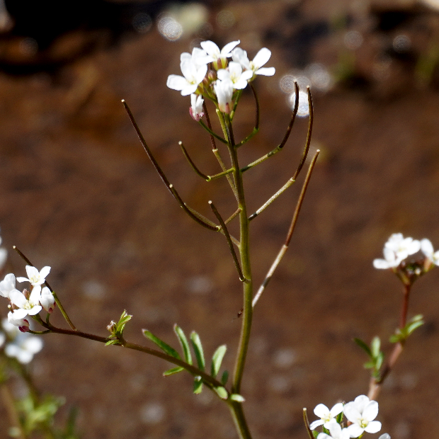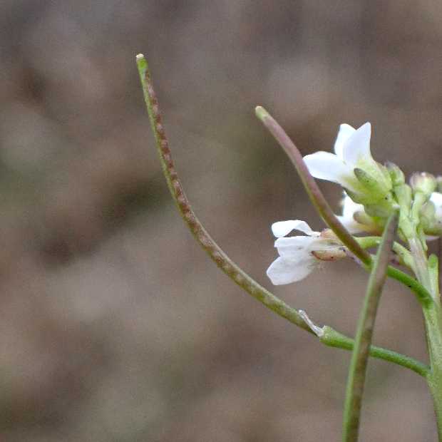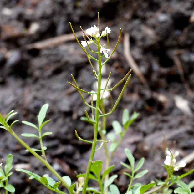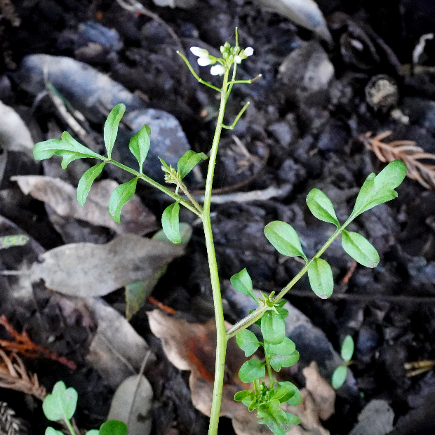 春の里山の田んぼで普通に見られるアブラナ科。 花弁が4枚の白く小さな花、 細長い果実、 丸みがあるように切れ込んだ羽状の葉などが特徴です。 茎葉は天ぷらやお浸しとして食べることもできます。