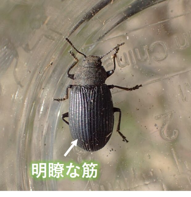 ゴミムシダマシの仲間。 草はら、 荒地、 河川敷などで普通に見られます。 黒色で光沢はにぶく、 上翅にはっきりした筋があります。