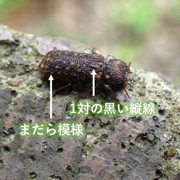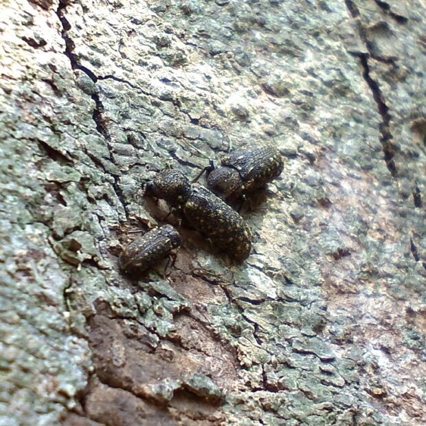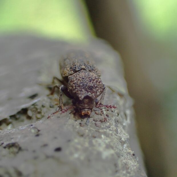 枯木に集まるナガシンクイムシの仲間。 ゴツゴツした筒状の体で、 頭部は下向きについています。 メスは枯れ木の内部(材)に産卵し、 幼虫は材を食べて育ちます。 明かりにやって来ます。