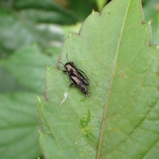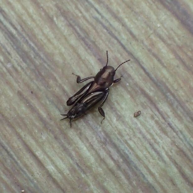 やや湿った裸地で見られるノミバッタ科の仲間。 メタリックに黒光りした小さな体。 後あしが太く、 名前の通り「ノミ」のようによく跳ねますが、 飛翔することはできません。