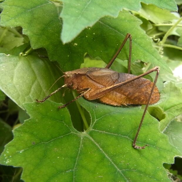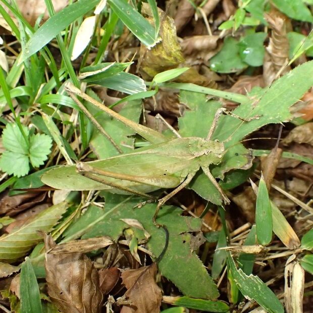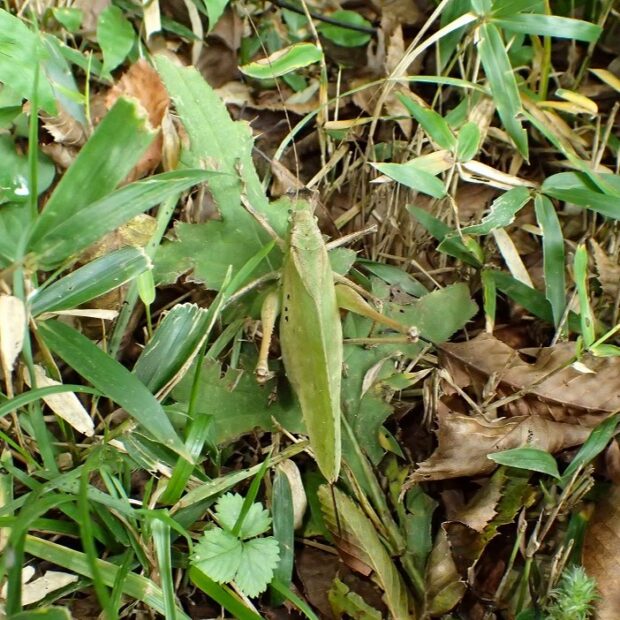 林縁のクズ群落などで見られるクツワムシ科の仲間。 大形で、 褐色型と緑色型がいます。 夜行性で、 夜、 大きな声で鳴きます。 近年、 生息地は減少しています。