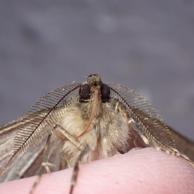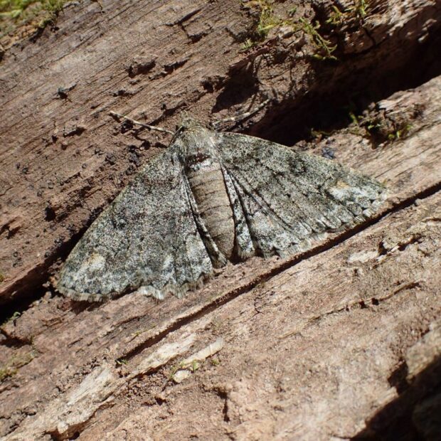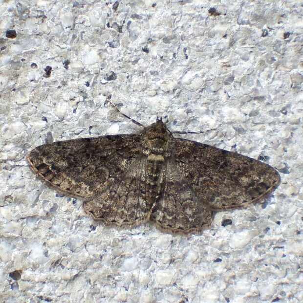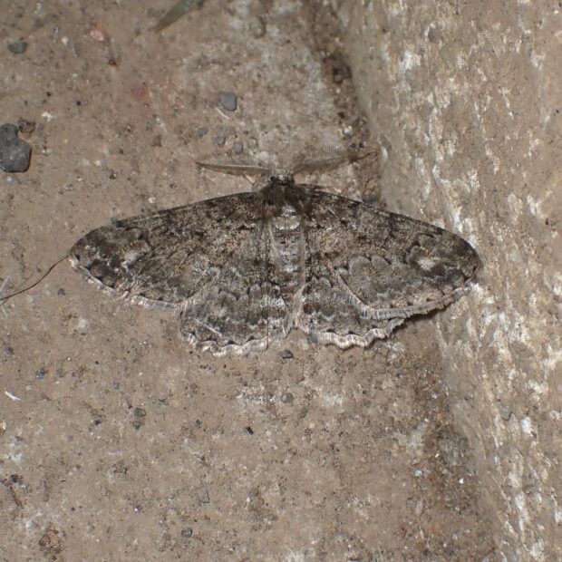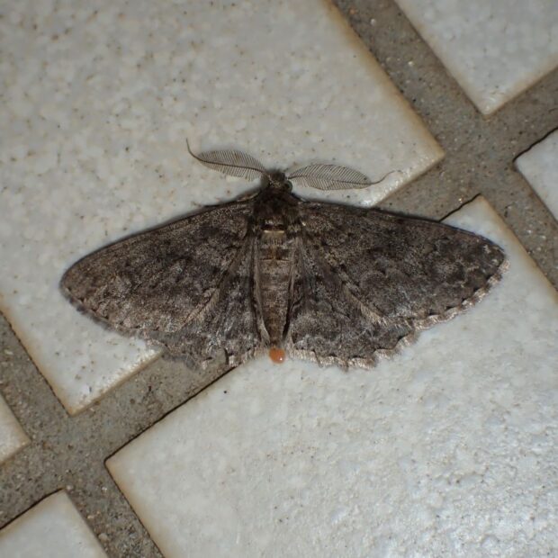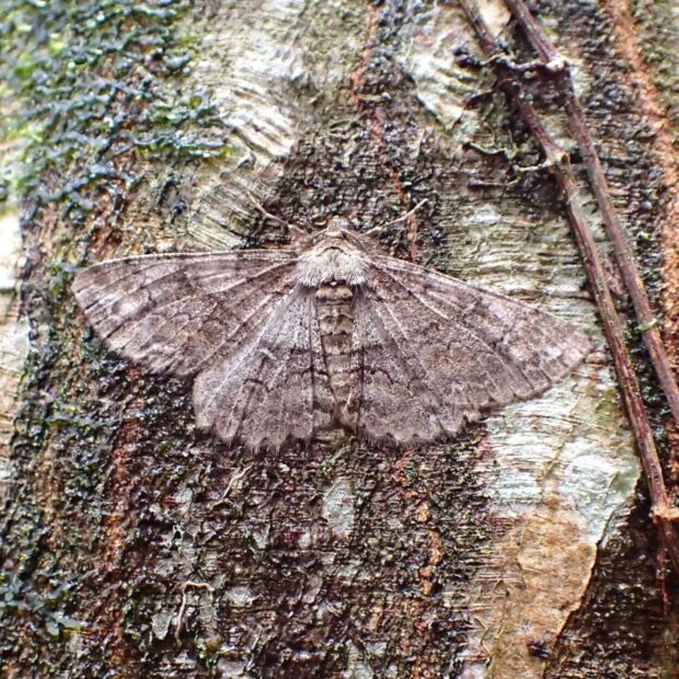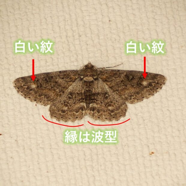 地味な色で、 白い紋があるエダシャク。 色や模様はいろいろで変異が見られます。 触角は、 オスはくし歯状で、 メスは糸状。 冬から早春にかけて普通に見られます。
