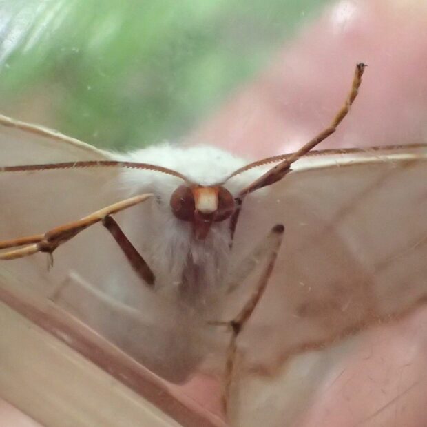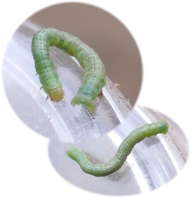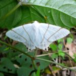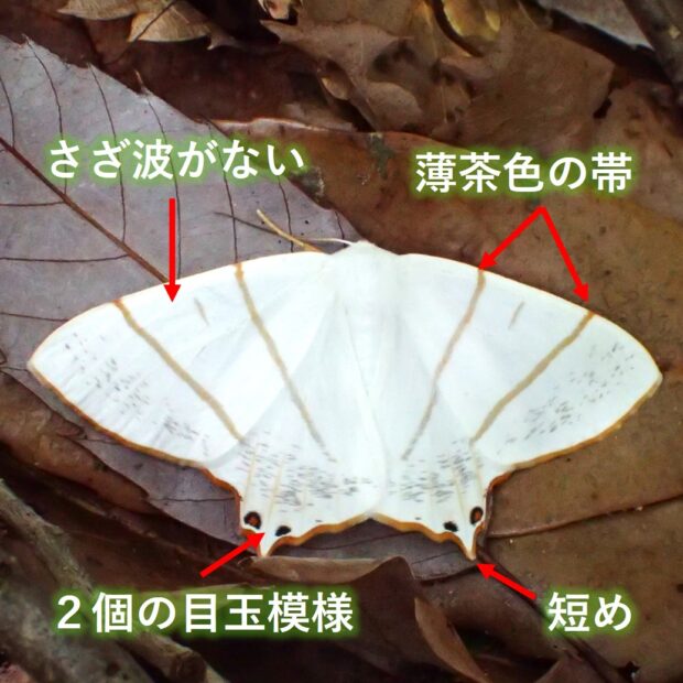 白色のはねに薄茶色の帯があるエダシャクの仲間。 後ばねの尾状突起が「ツバメ」の名前の由来です。 オスの触角はくし歯状、 メスは糸状で、 くし歯状の触角をもつものは、 ツバメエダシャクの仲間では本種のオスのみです。