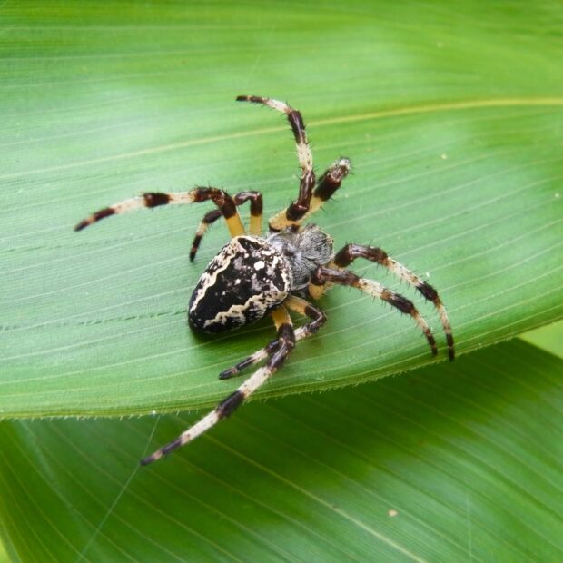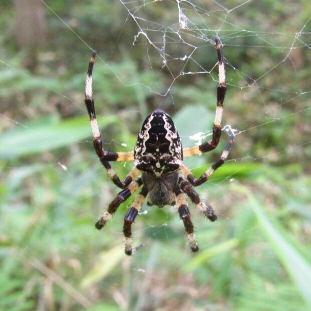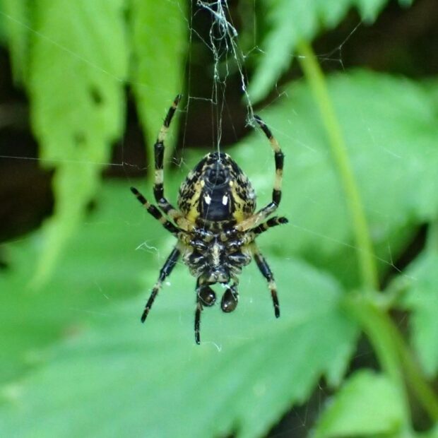 山でよく見られるコガネグモの仲間。 腹部には波状の模様があり、 やや細長い形をしています。 木の間に丸い網(正常円網)を張り、 夜に張りかえます。