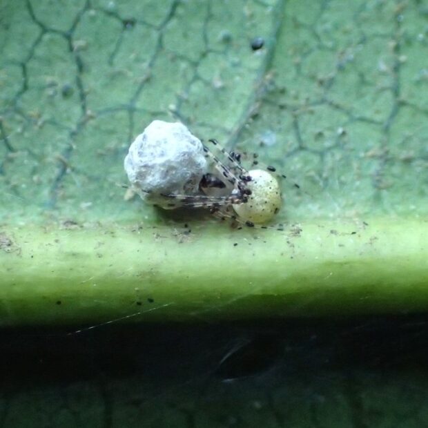 クモを襲うヒメグモの仲間。 都市部から山地まで広く生息し、 木の葉裏などで普通に見られます。 腹部前方の2個の黒い紋と、 頭胸部の黒い筋が特徴。 葉や枝を歩き回り、 クモに粘球のある糸を投げかけて捕えます。