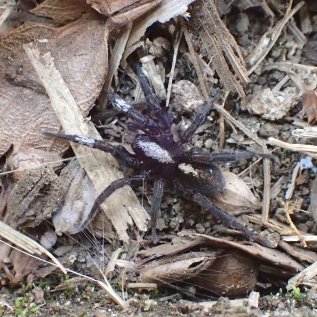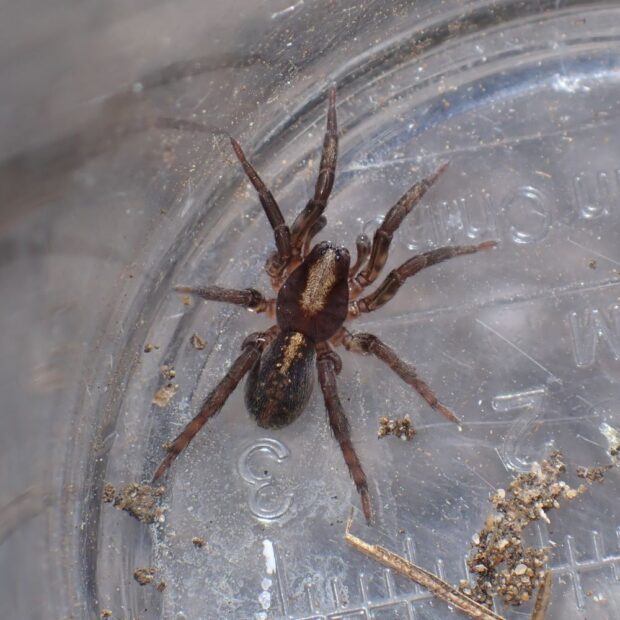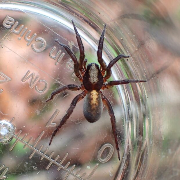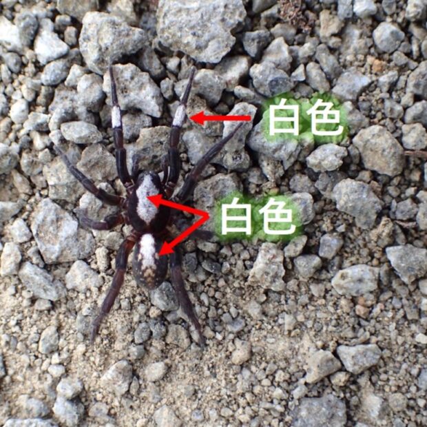 オスとメスで色や模様が違うコモリグモの仲間。 水辺周辺の林や草はらなど、 地面を歩き回り獲物を捕えます。 コモリグモは、 卵のうをお尻につけて持ち歩き、 出てきた子ぐもを背中に乗せて守ります。