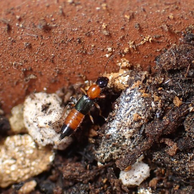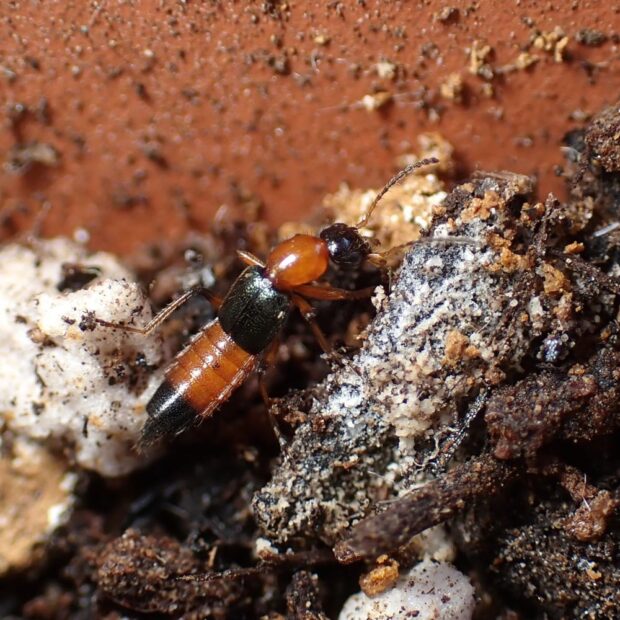 オレンジと黒の小さなハネカクシ。 田んぼや湿った草地の植物の根元や石の下などで、 普通に見られます。 上翅(じょうし)が青いことから「アオバ」と名づけられました。 成虫はよく飛び、 明かりにやって来ます。