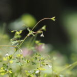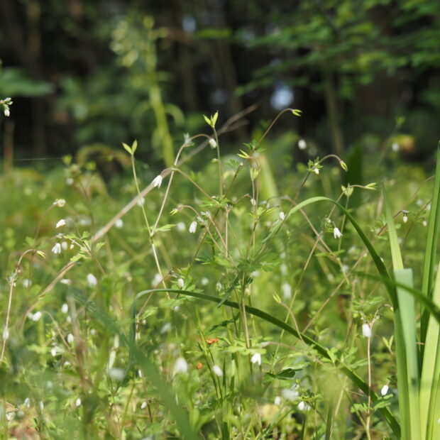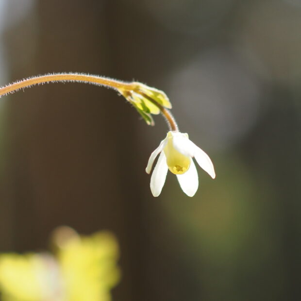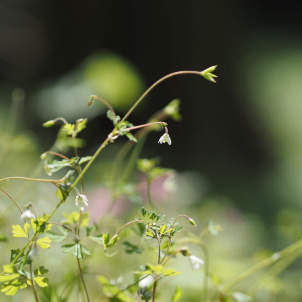 草の高さは10~30cmと小さく、 細い茎の先に5mmほどの小さな白い花を下向きに咲かせます。 花はオダマキに似ており、 白い部分は花弁でなくがく片で、 内側の黄色い部分が花弁です。