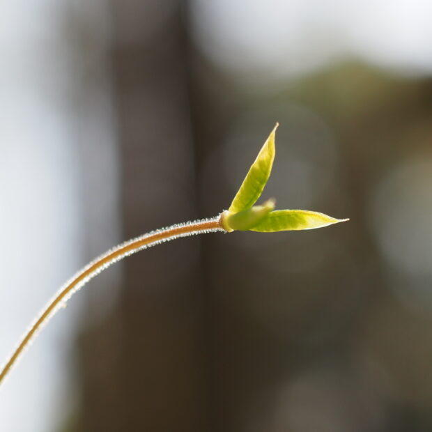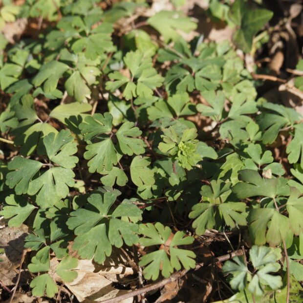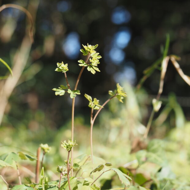 ヒメウズは多年草で、 冬の間は地面に張り付くように葉を茂らせて光合成をおこない、 3月ごろに花茎を伸ばして小さな花を咲かせます。 5月には種子を落とし、 地上部は枯れて、 秋の終わりごろまで地下で休眠する生活をしています。