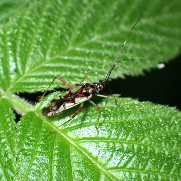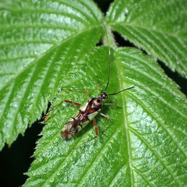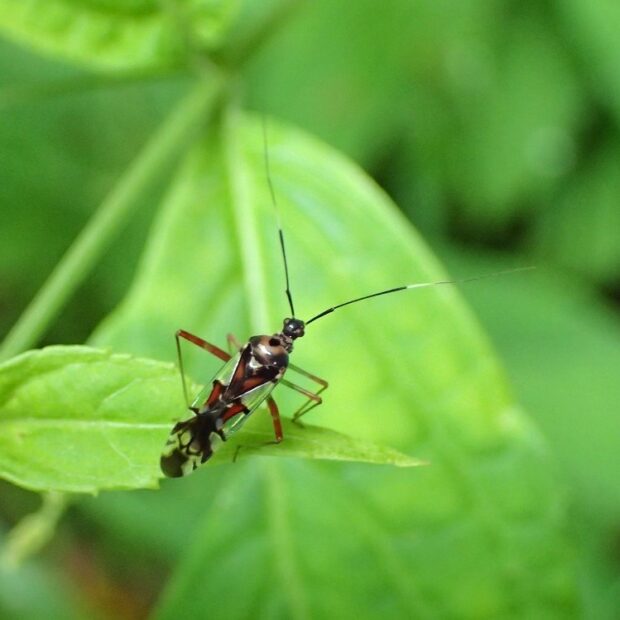 複雑な色合いの美しいカスミカメムシ。 山の薄暗い林縁の下草で見られます。 前ばねは半透明で、 触角とあしは長く、 スマートな体型をしています。