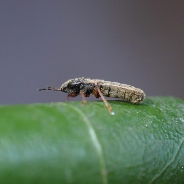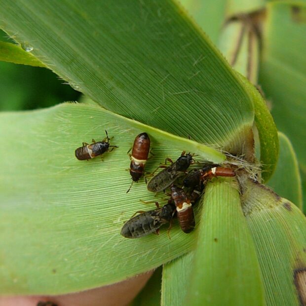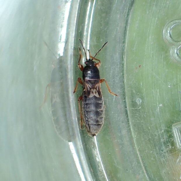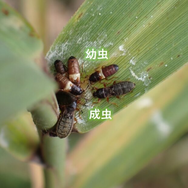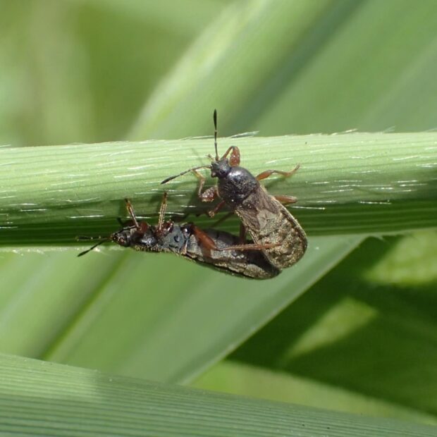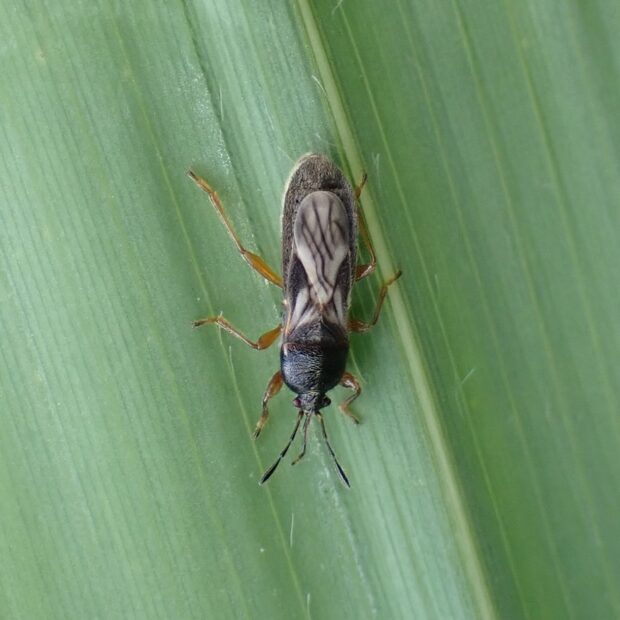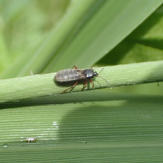 ヨシやマコモなどで見られる細長いナガカメムシの仲間。 はねが短い短翅型とはねが長い長翅型が見られます。 似ている種類が多く識別には注意が必要。
