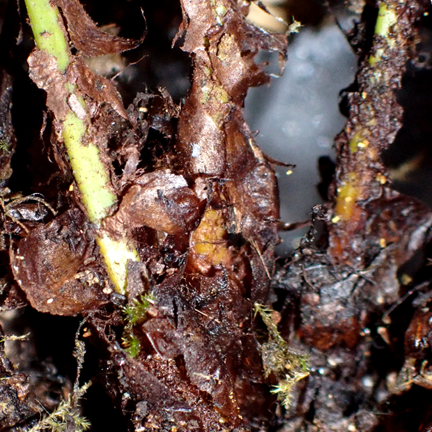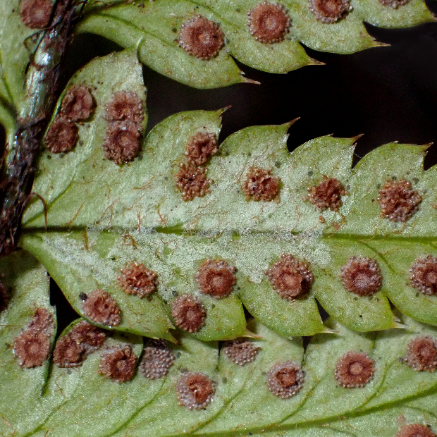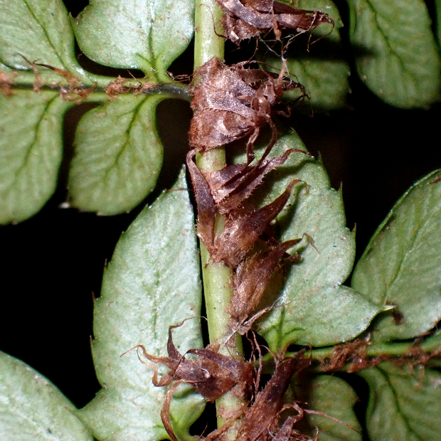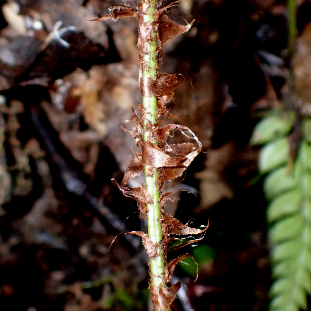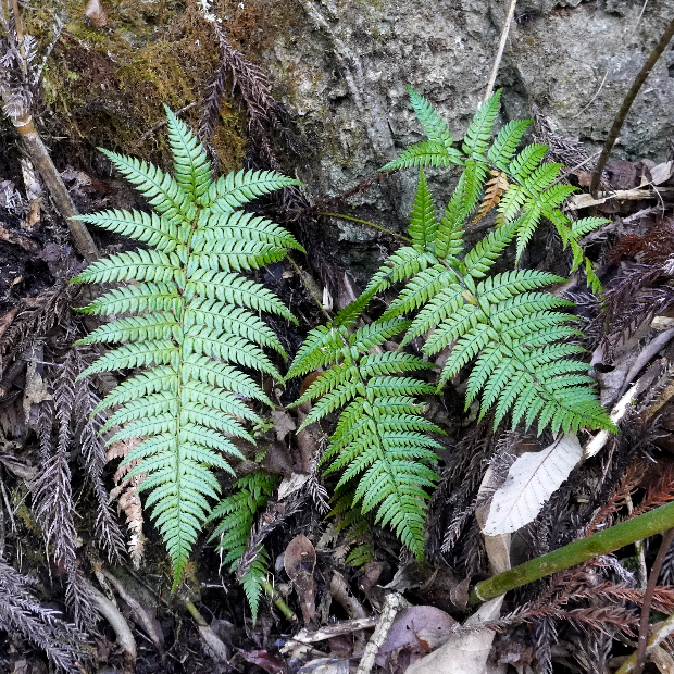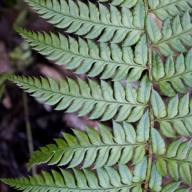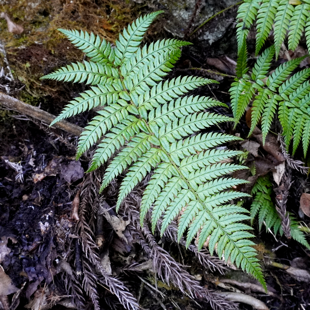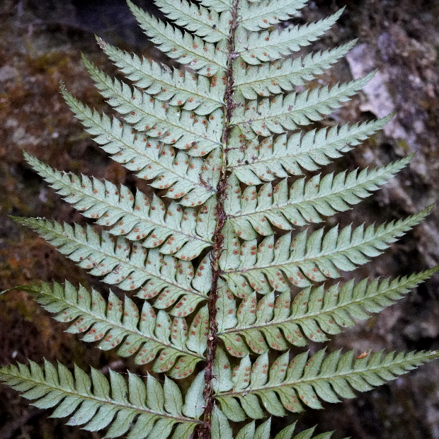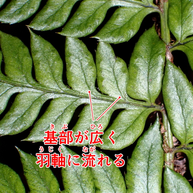 まれに見られるイノデの仲間のシダ。 葉は明るい緑色で硬く、 葉柄や葉軸には幅広い茶色の鱗片が多くつきます。 それぞれの小羽片の先は針のように尖っているので、 握ろうとすると痛く、 いかにも鬼といえる風格です。