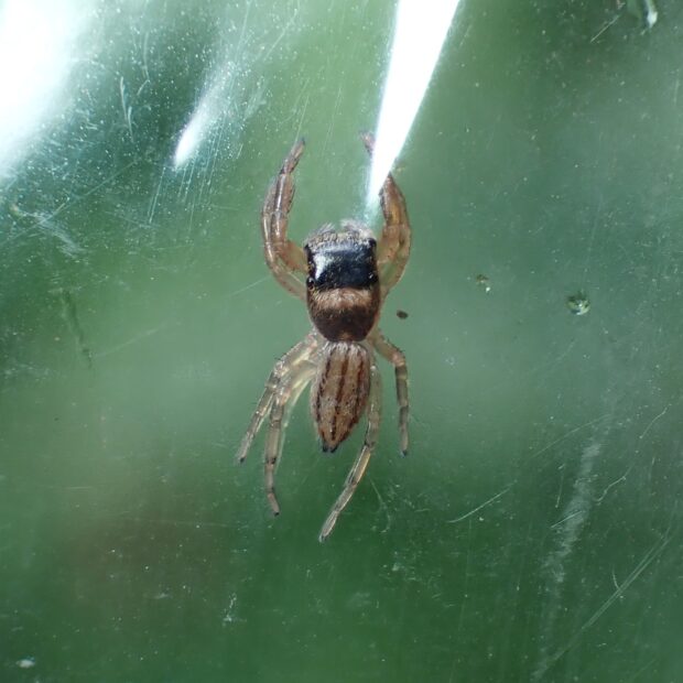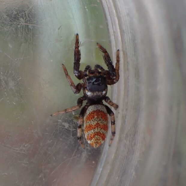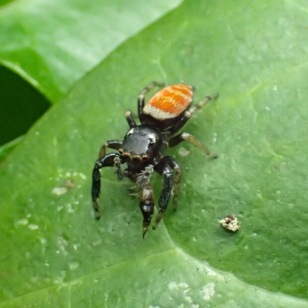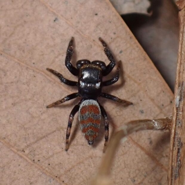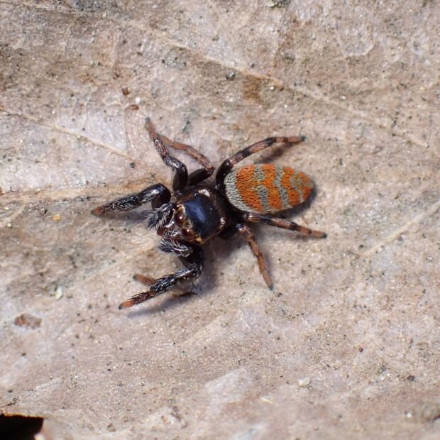 カラフルなハエトリグモ。 メスもオスも、 腹部にあるオレンジ色の4本のしま模様が特徴的。 草地や樹林地の下草などで普通に見られ、 歩き回って獲物を探します。