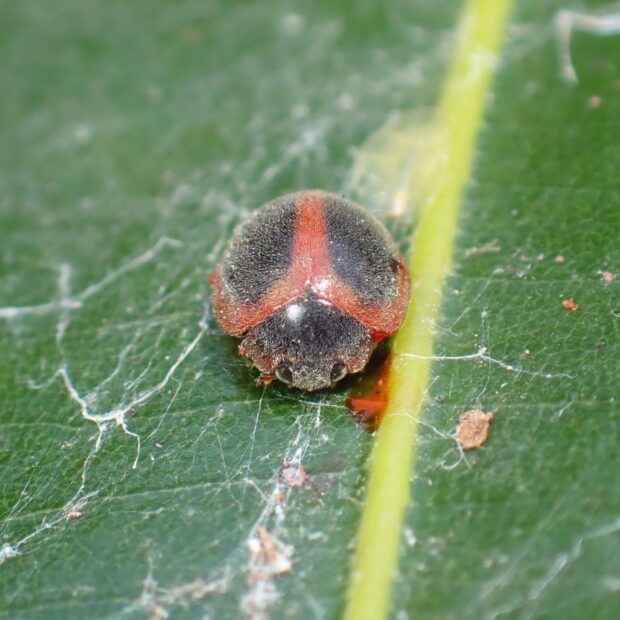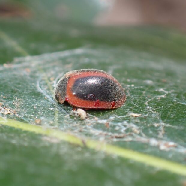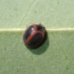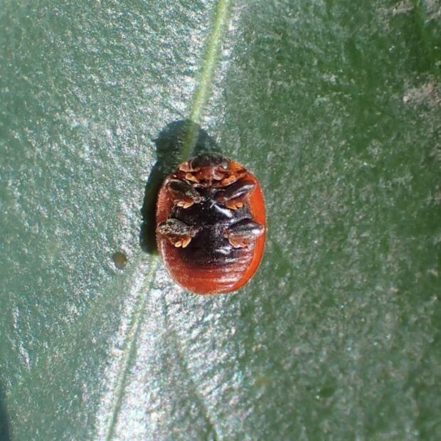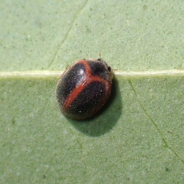 左右の黒いはねに赤い縁どりがある小さなテントウムシ。 体は黒色で光沢がなく、 微毛でおおわれています。 幼虫や蛹はアカイロテントウに似ており、 識別は難しいです。