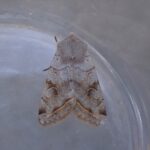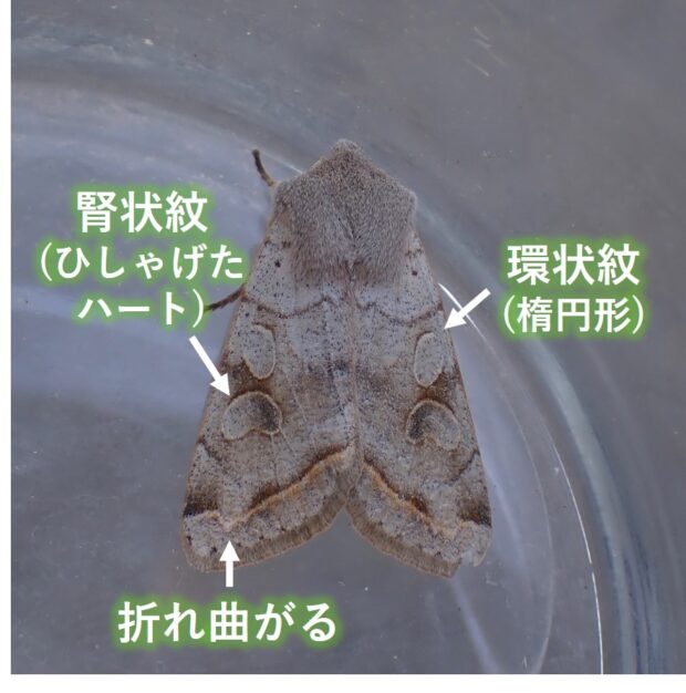 ヤガ科ヨトウガの仲間。 春に成虫になる「春キリガ」の一種。 早春、 雑木林や公園などで見られ、 明かりによくやって来ます。 淡い色の前ばねには複雑な模様があり、 触角は、 オスは鋸歯状で、 メスは糸状です。