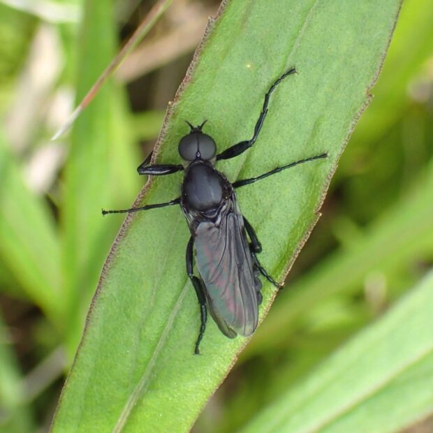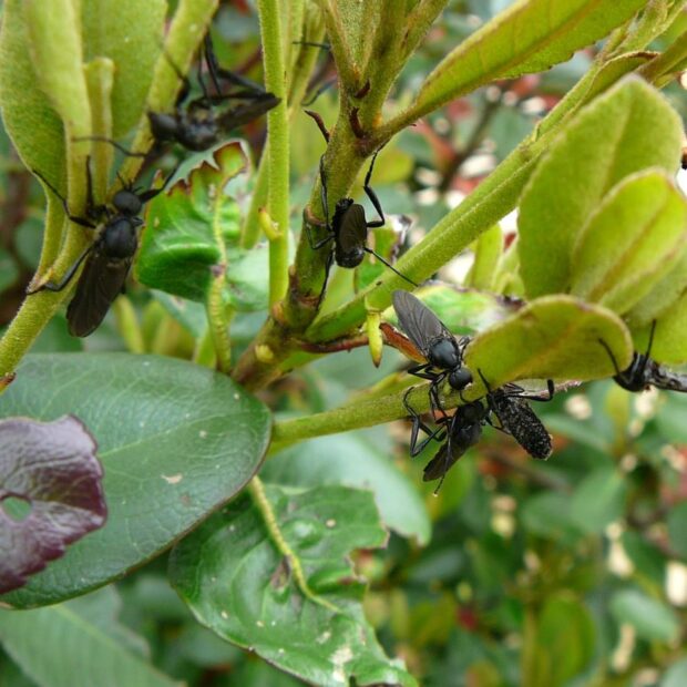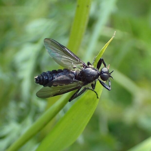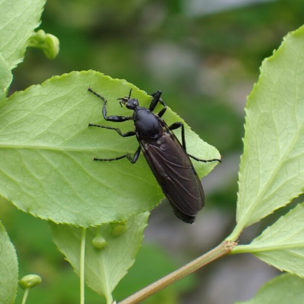 オスメスともに体もはねも黒いケバエの仲間。 オスは複眼が大きく、 メスは複眼が小さいです。 春、 公園や雑木林などで普通に見られ、 木の花などに集まります。 幼虫は毛の生えたイモムシ軍団で、 落ち葉などを食べる分解者。 地上で群れて冬を越します。