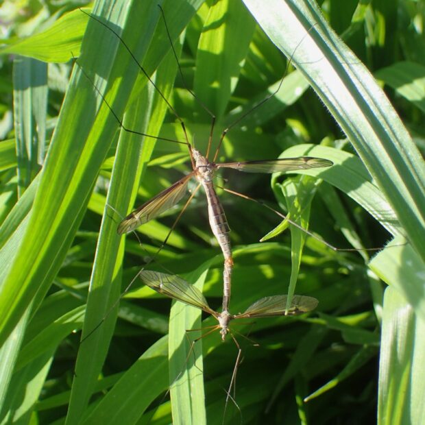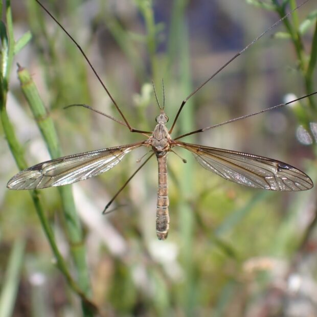 田んぼや畑に多いガガンボ。 成虫は2回、 春と秋に現われます。 幼虫が腹部を途中から切ったような形をしているため、 キリウジと名づけられました。 明かりにもよくやって来ます。