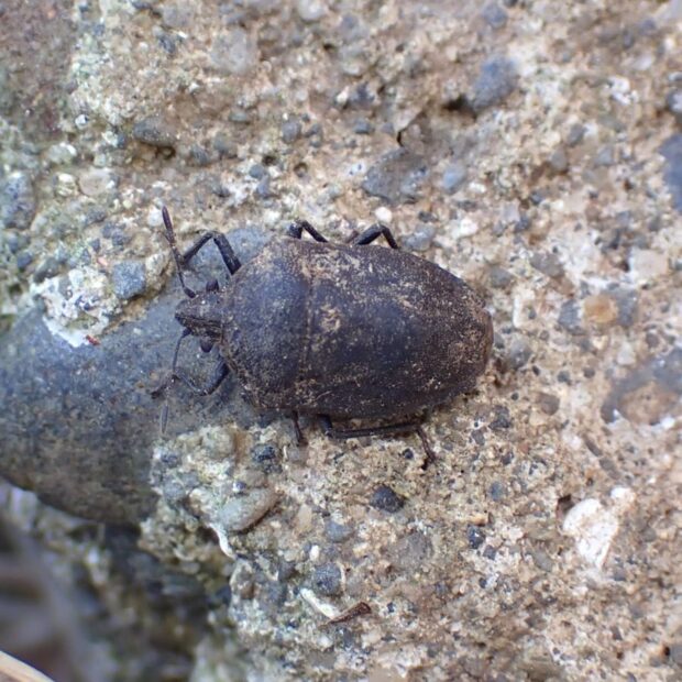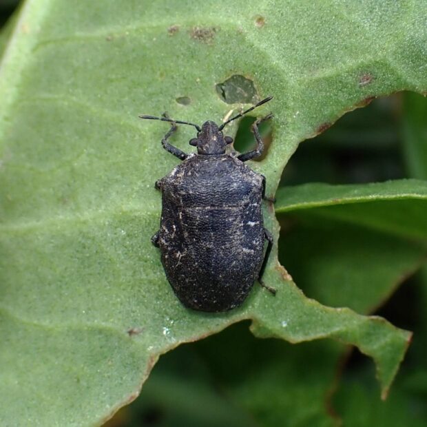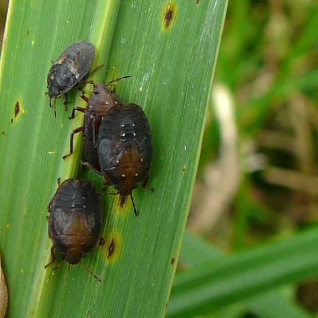 田んぼや湿った草地などで見られるカメムシ。 オオクロカメムシに似ていますが、 本種は頭部先端が凹みません。 イネやヨシなどのイネ科植物につき、 茎から汁を吸います。
