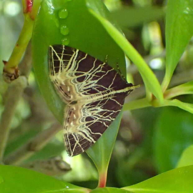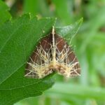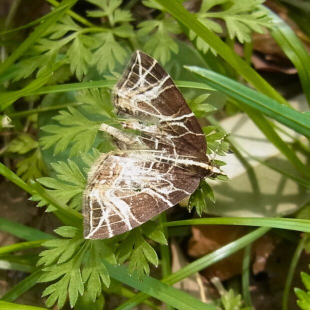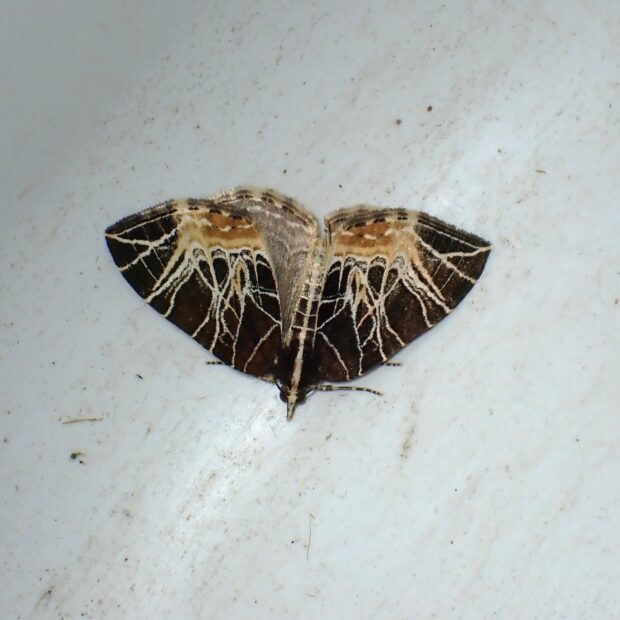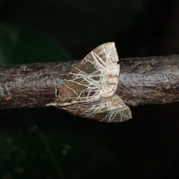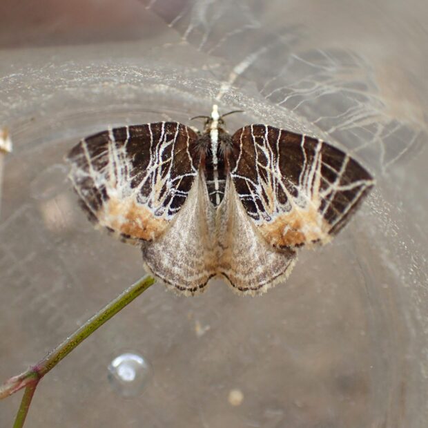 ナミシャクの仲間。 黒褐色の前ばねに、 キノコの菌糸のように走る白いスジ模様が特徴的。 日中、 草などにとまっており、 普通に見られます。
