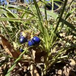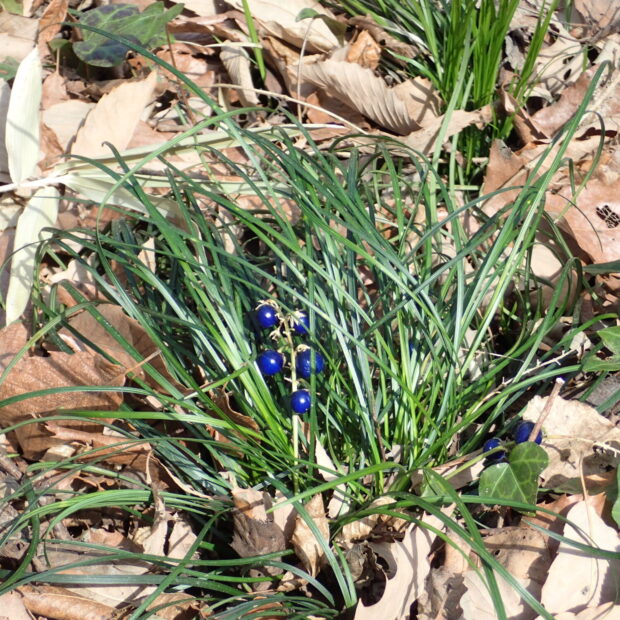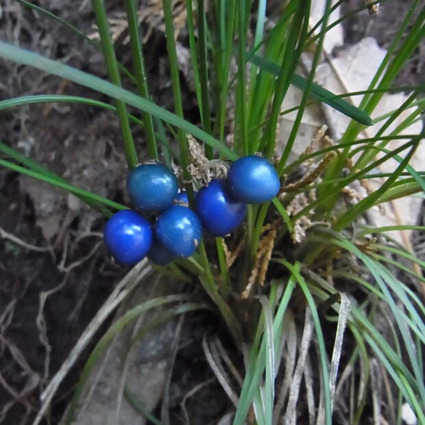 別名をリュウノヒゲ(龍の髭)。 細長い葉が髭のようなので名前にヒゲとつきました。 果実のように見える青い種子は、 ハズミ玉ともいい、 地面に投げ打つとよく弾みます。