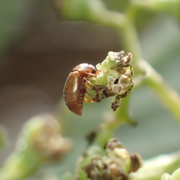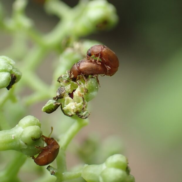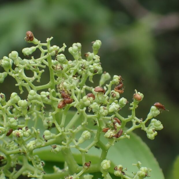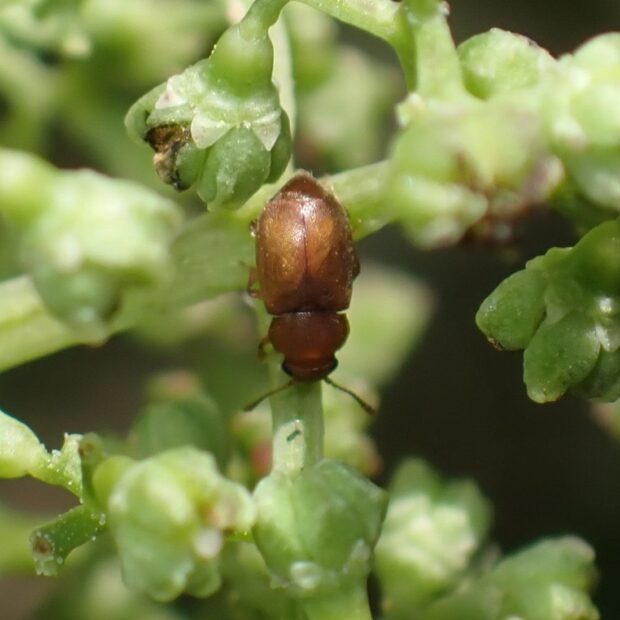 花に集まるチビハナケシキスイの仲間。 春、 ニワトコの花で、 普通に見られます。 ケシキスイの仲間は、 触角の先端3節が幅広く、 お尻(腹部先端)がはねからはみ出しているものが多いです。