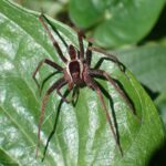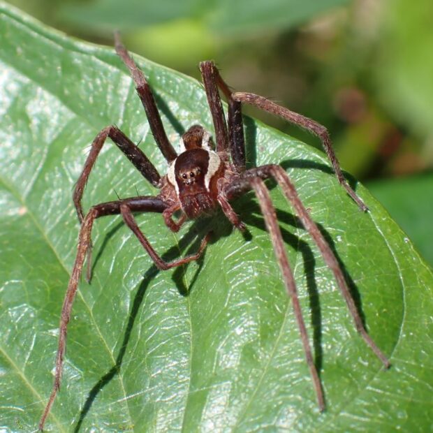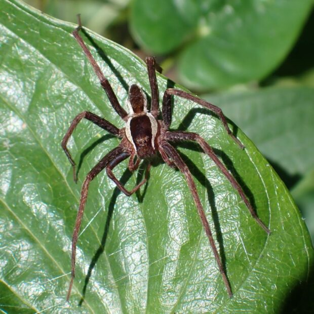 山に多いキシダグモの仲間。 林道の草木の葉の上にとまり、 獲物を待ち伏せします。 背面には白で囲まれた幅広い赤褐色の帯があります。 似ているハシリグモが数種類いますので識別には注意が必要。