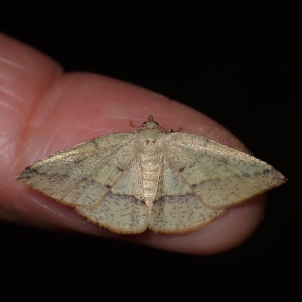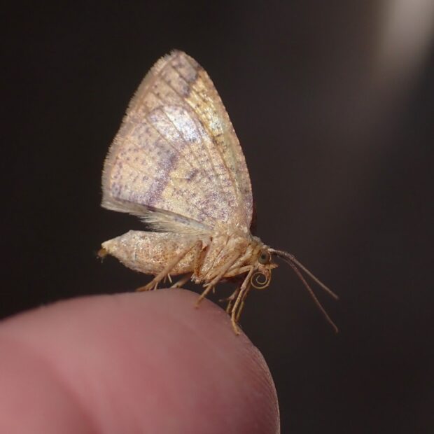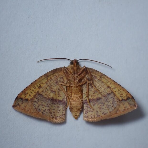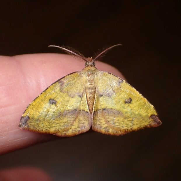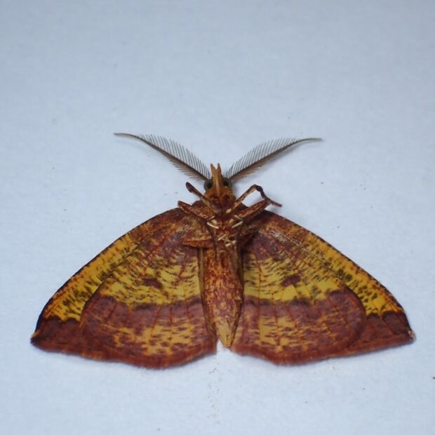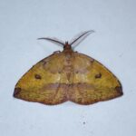黄色いはねに紋があるエダシャク。 色や模様は変異がありさまざまです。 幼虫はスイカズラの仲間の葉を食べるシャクトリムシ。
