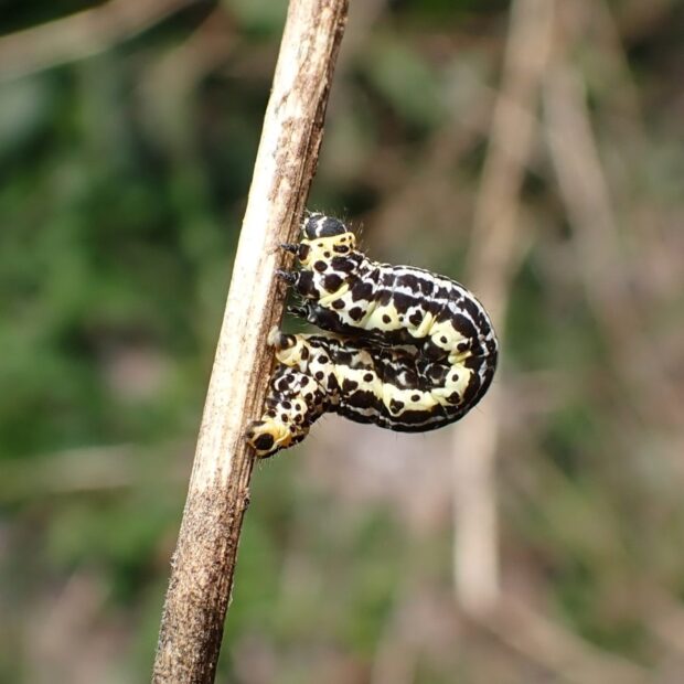• 幼虫。 黄色と黒のシャクトリムシ。