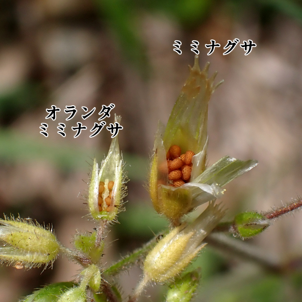 ミミナグサは①茎先に花をまばらにつけ、 ②花の柄が長く、 ③種子は径1mmほどとオランダより2倍くらい大きく、 ④花の時期は5月くらいとやや遅めです。