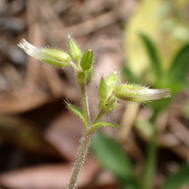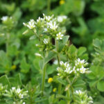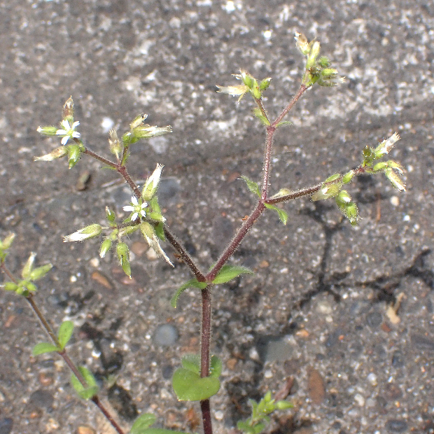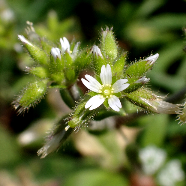 市街地でもごく普通に見られる草花。 花は白くて小さく、 全体にねばついた毛が多いので、 触るとフワフワねばねばします。 名前の耳菜(ミミナ)は、 葉の形がネズミの耳に似ていることが由来です。