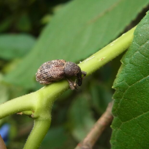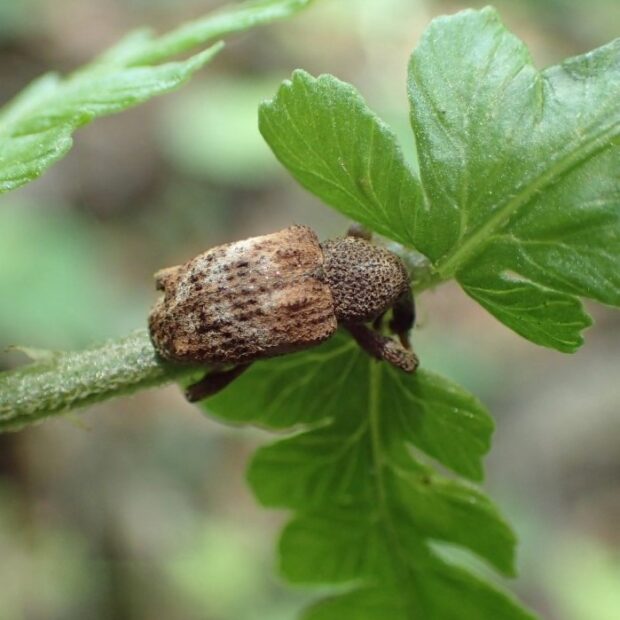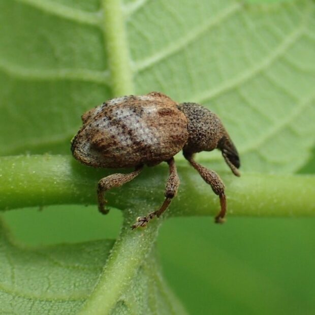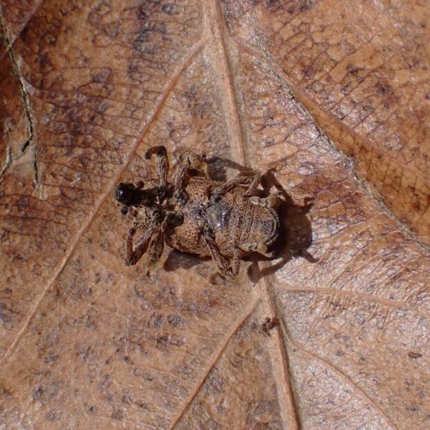 アナアキゾウムシの仲間。 体はゴツゴツしており、 上翅にはコブがあります。 メスはドングリに穴をあけて卵を産み、 幼虫はドングリの中で育ちます。