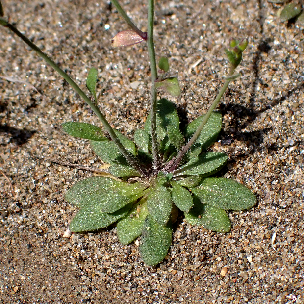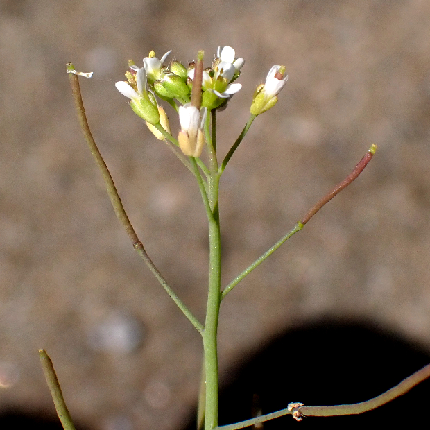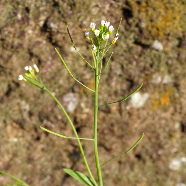ヨーロッパ原産のアブラナ科の外来種で、 住宅地でもよく見られます。 白くて小さな花、 細長い果実、 丸みのある小さな葉が特徴です。